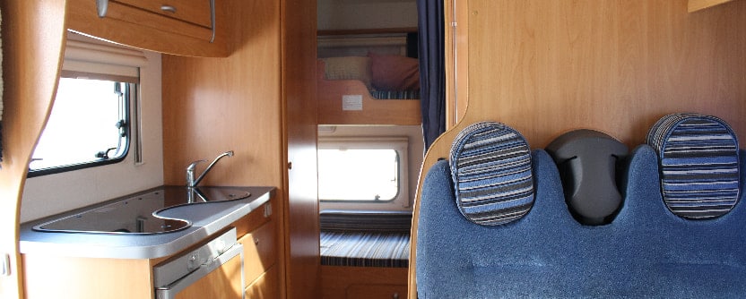 Otro de los más clásicos tipos de interior de autocaravanas, es realmente útil cuando se viaja con niños. Así, los más pequeños podrán tener su cama individual y todo será más cómodo para ellos. Para la instalación de camas gemelas de para el uso de niños en el interior de una autocaravana será necesario que exista una cama adicional para que los adultos puedan descansar.