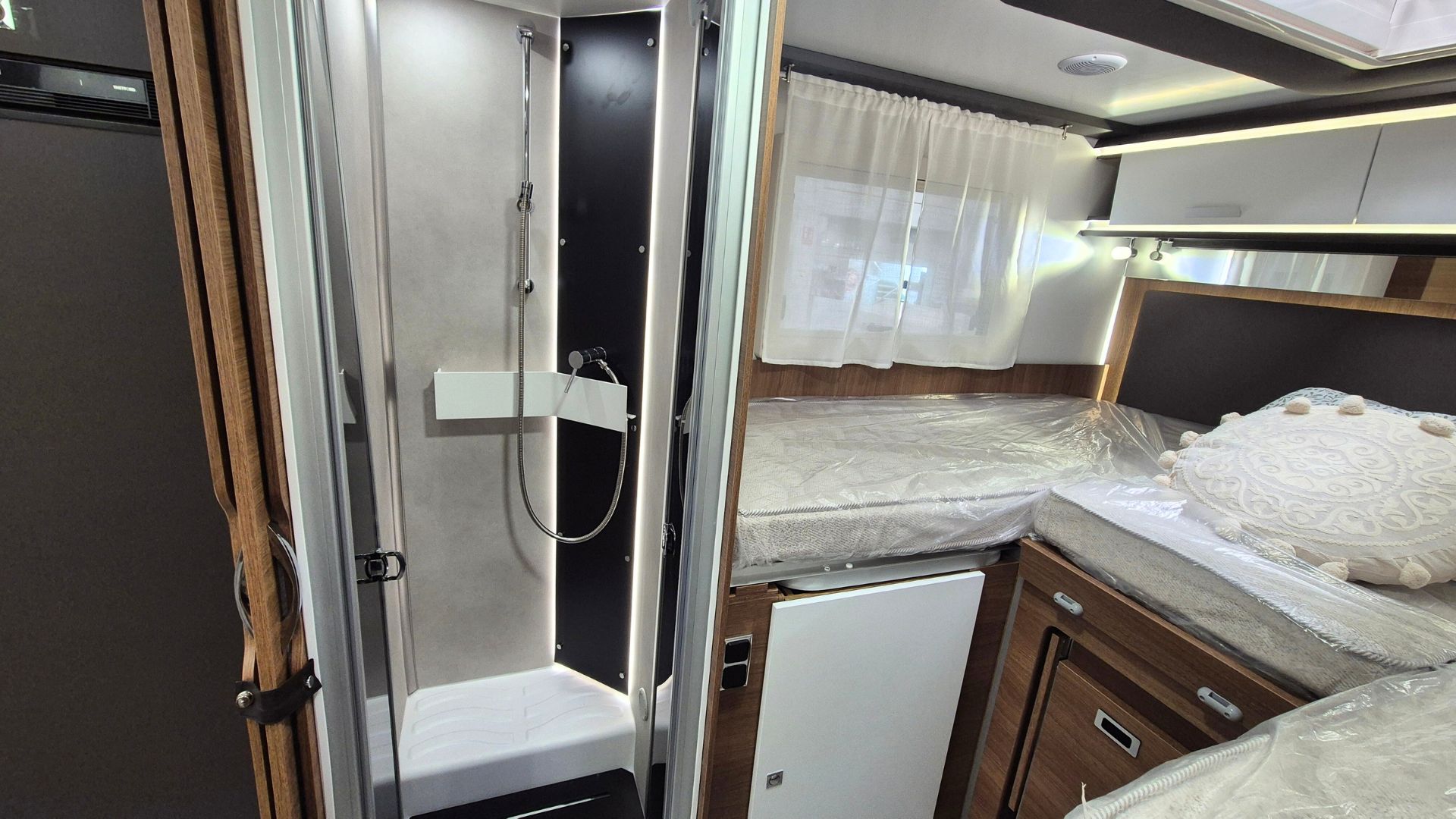 El dormitorio ofrece camas gemelas transformables en cama doble de 170×210 cm, colchones de alta densidad, tomas USB, iluminación LED en cabezal y acceso directo al garaje. Se suma una cama de techo eléctrica (hasta 230 kg) para ampliar plazas sin perder espacio y una cama individual en salón convertible.