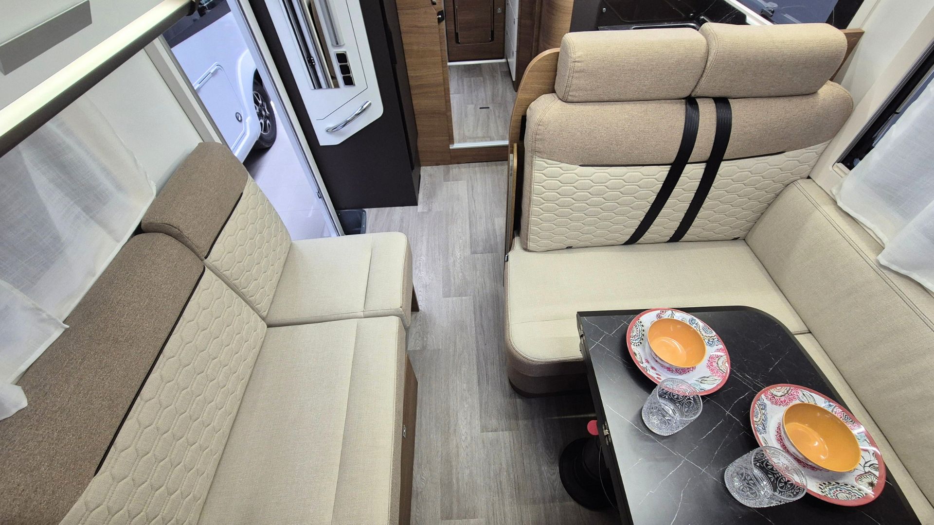 El interior de la Autocaravana Benimar Mileo 263 presenta el nuevo ambiente MÁLAGA, con acabados decorativos, iluminación LED y una sensación de hogar moderna y cálida. El salón en L cuenta con asientos ISOFIX, mesa telescópica multiposición y una puerta separadora para mayor privacidad.