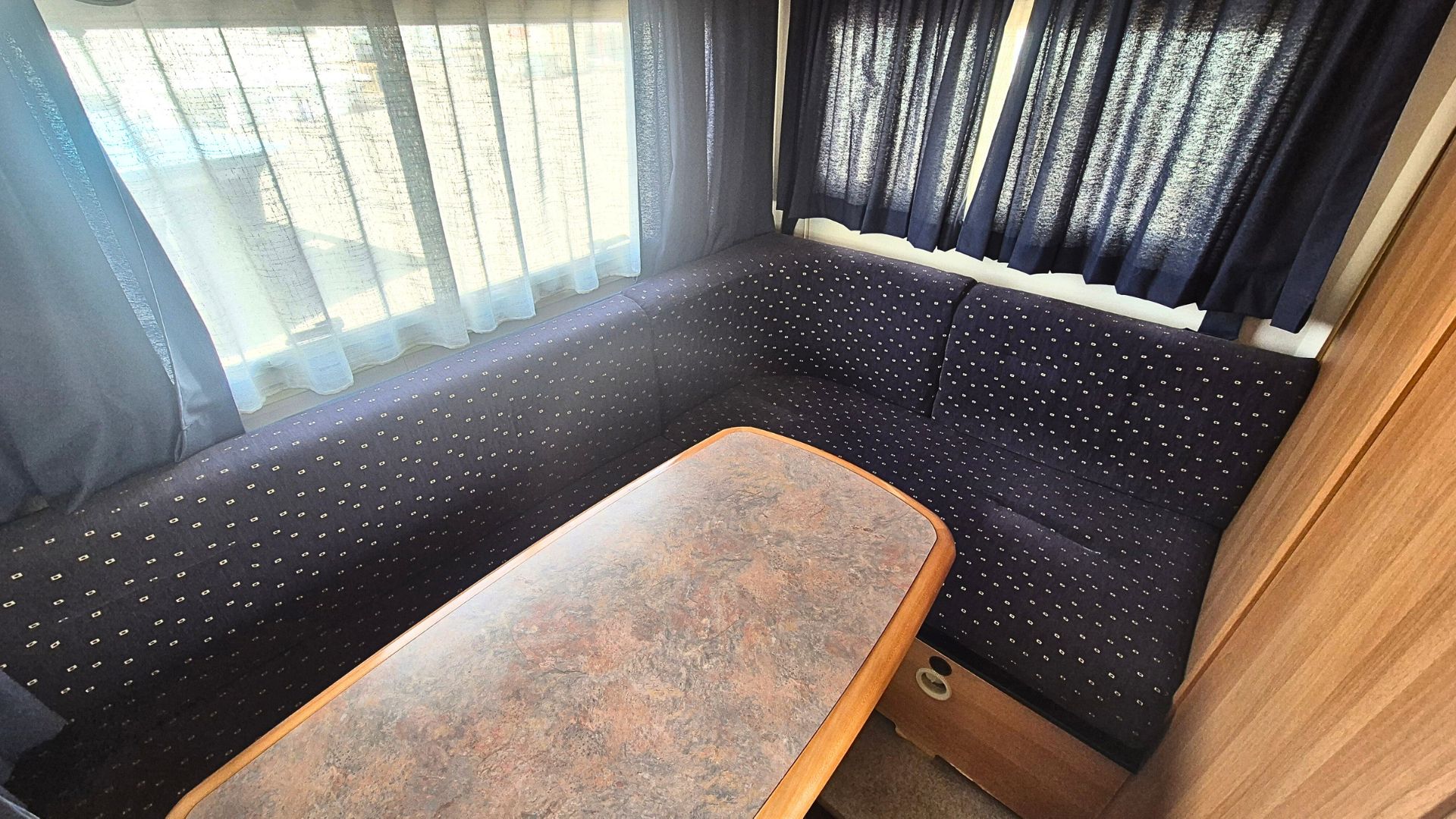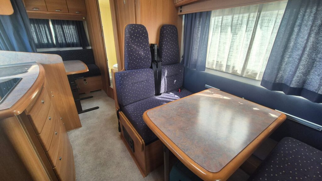 Autocaravana de segunda mano Benimar Europe 6000SL con 6 plazas, 107.400 km, cama capuchina, salones convertibles, completo equipamiento interior, placas solares, calefacción Truma, aire acondicionado, toldo F45S y numerosos extras de confort y seguridad.