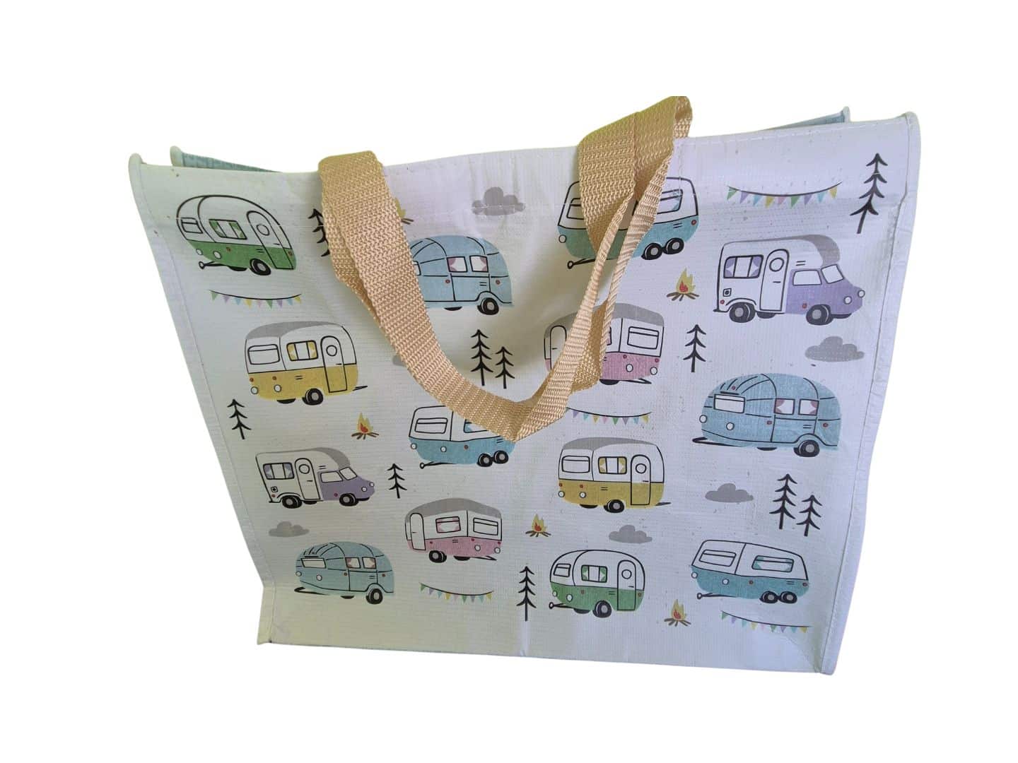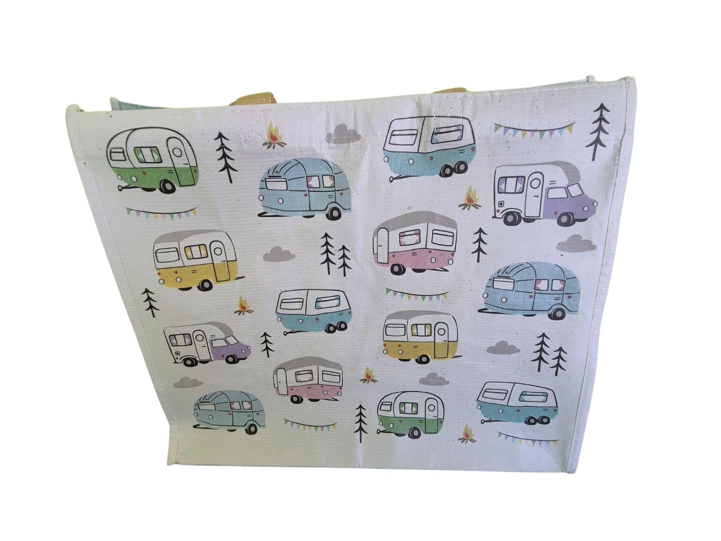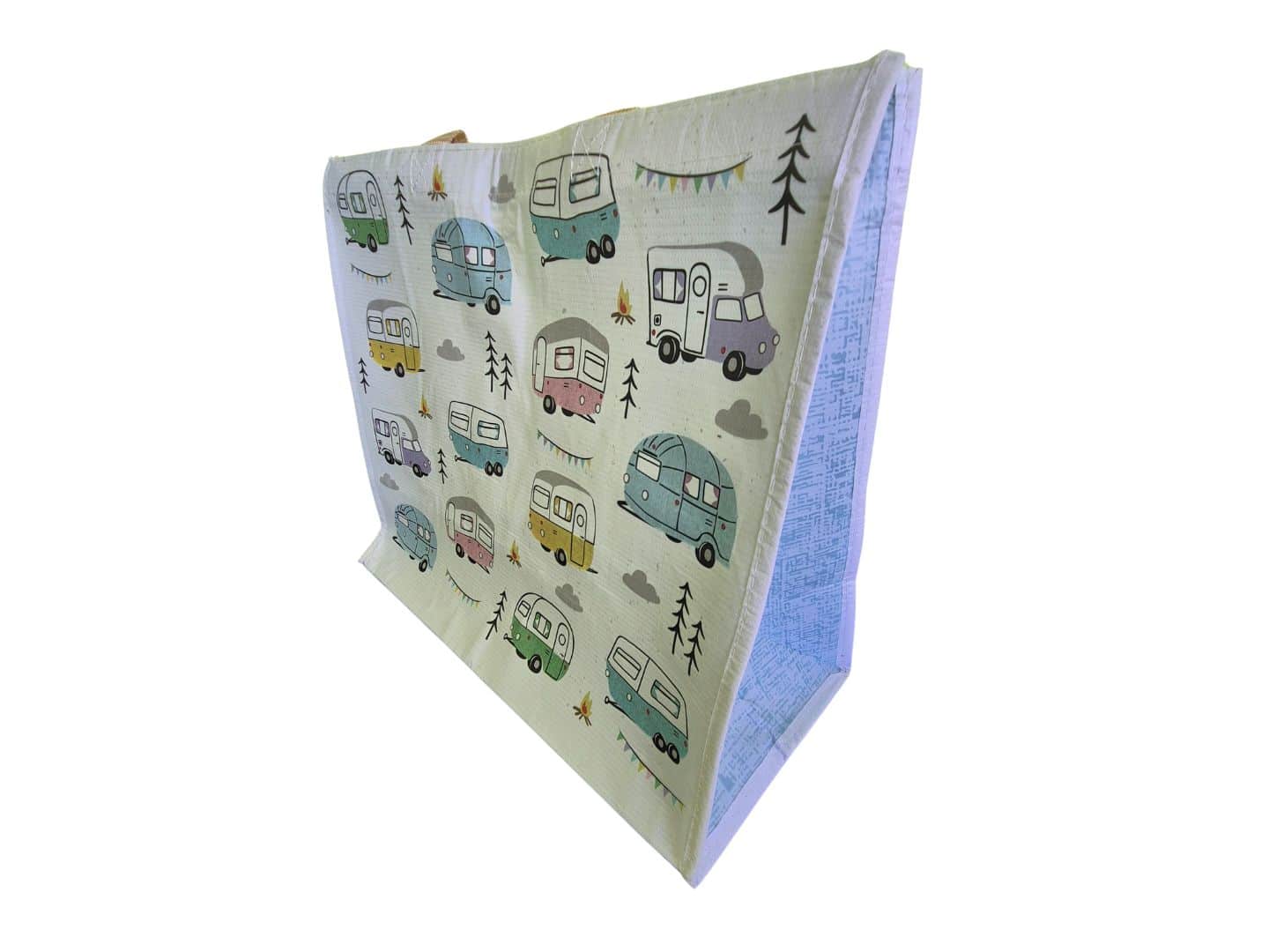 El estampado de esta bolsa de caravanas y autocaravanas es una celebración del espíritu aventurero. Con ilustraciones de caravanas clásicas, autocaravanas y escenarios naturales, esta bolsa captura la esencia del caravaning y su conexión con la libertad de viajar. Es perfecta para los amantes de los detalles originales y el estilo campista.