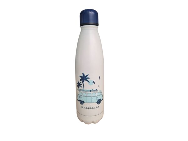 - Diseño exclusivo de camper Volkswagen: Esta botella está decorada con el clásico dibujo de la furgoneta Volkswagen, que evoca aventuras y viajes por carretera, haciéndola perfecta para los amantes de la marca y del estilo de vida aventurero.