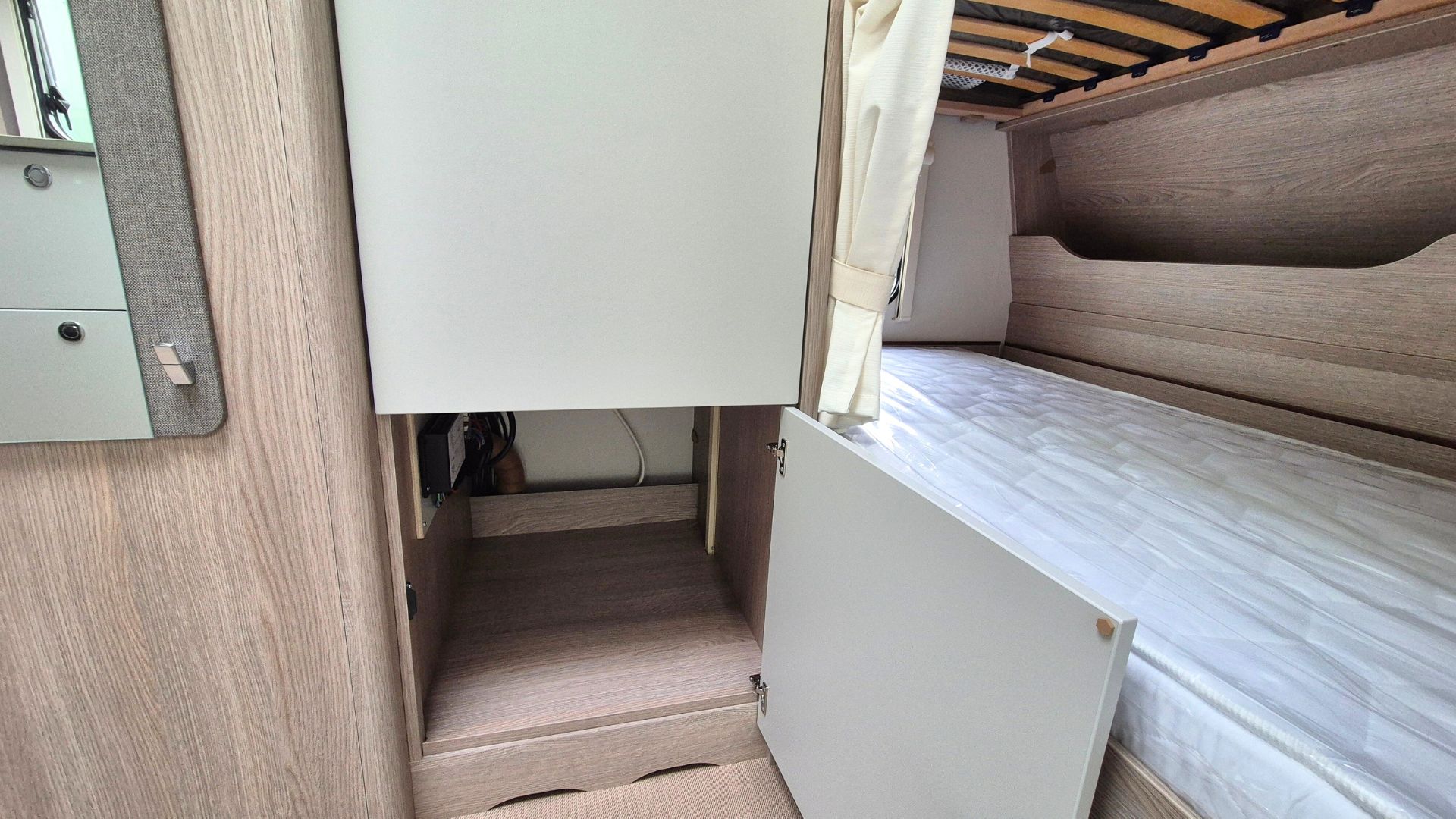 Esta caravana cuenta con un sistema eléctrico de 12V/230V, enchufes de 230V, tomas USB, interruptor central de iluminación, transformador de 350 VA, indicador digital de voltaje y nivel de agua, además de iluminación LED en el avancé. También incorpora detector de humo para mayor seguridad.