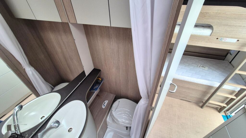 El baño está equipado con un WC tipo Cassette, y la zona de cocina incorpora una encimera con fregadero, cocina de 3 fuegos con encendido eléctrico y tapa de cristal, además de un frigorífico de gran capacidad: 142 litros, con congelador de 15 litros.